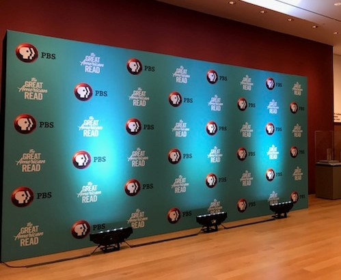 Step and repeat AV-Drop Modular Backdrop for PBS great American read event with up lighting