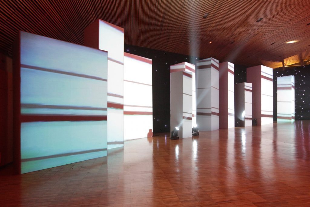 Layered Scenic Flats of AV-Drop Modular Backdrop with angles and curves for trade show