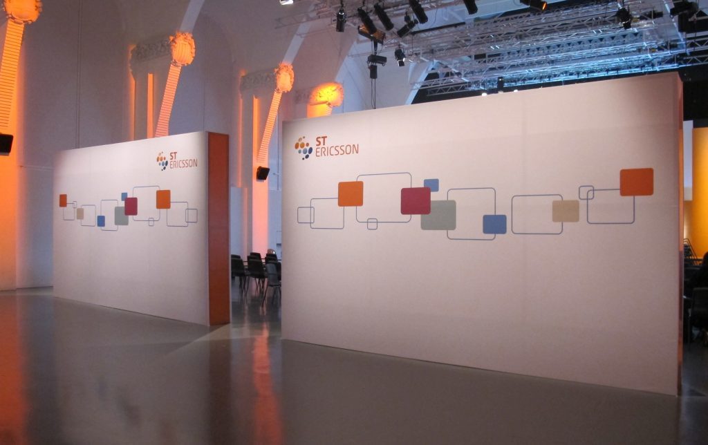 Multi Screen AV-Drop Modular backdrop with front hanging graphics for corporate meeting