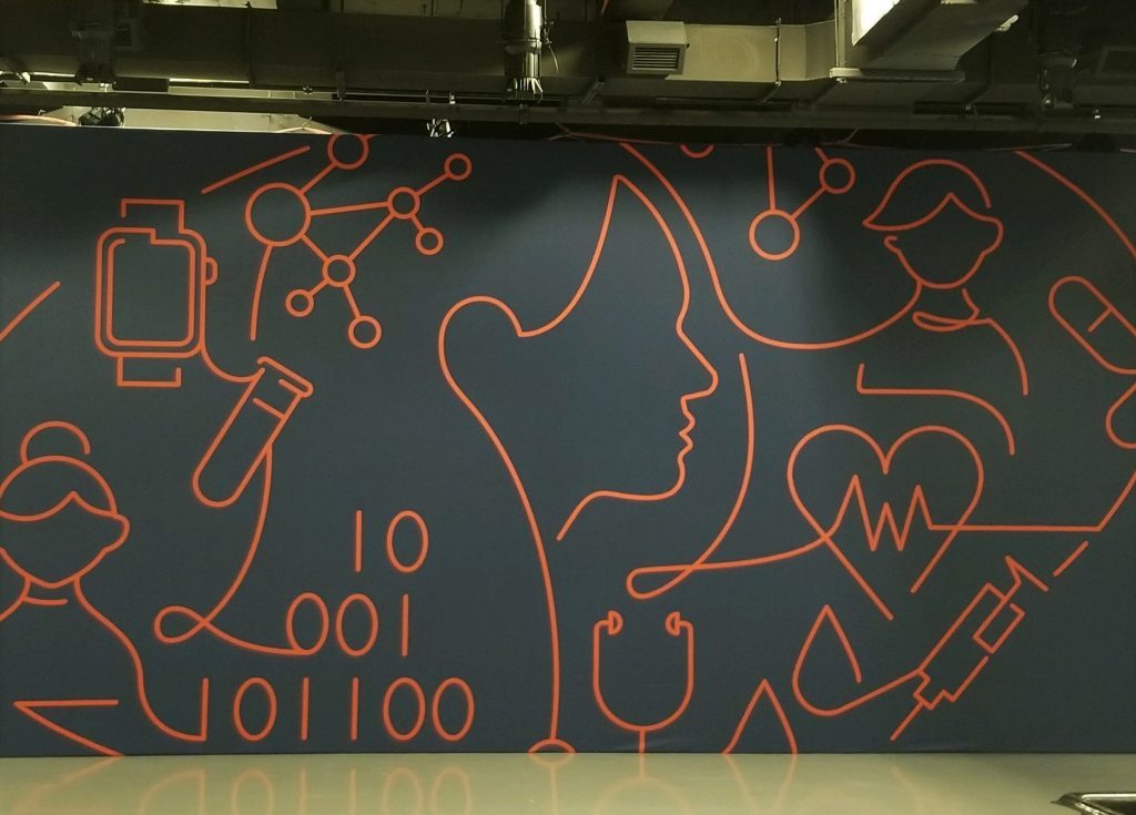 Seamless graphic print AV-Drop modular backdrop with dual screens printed in for corporate event